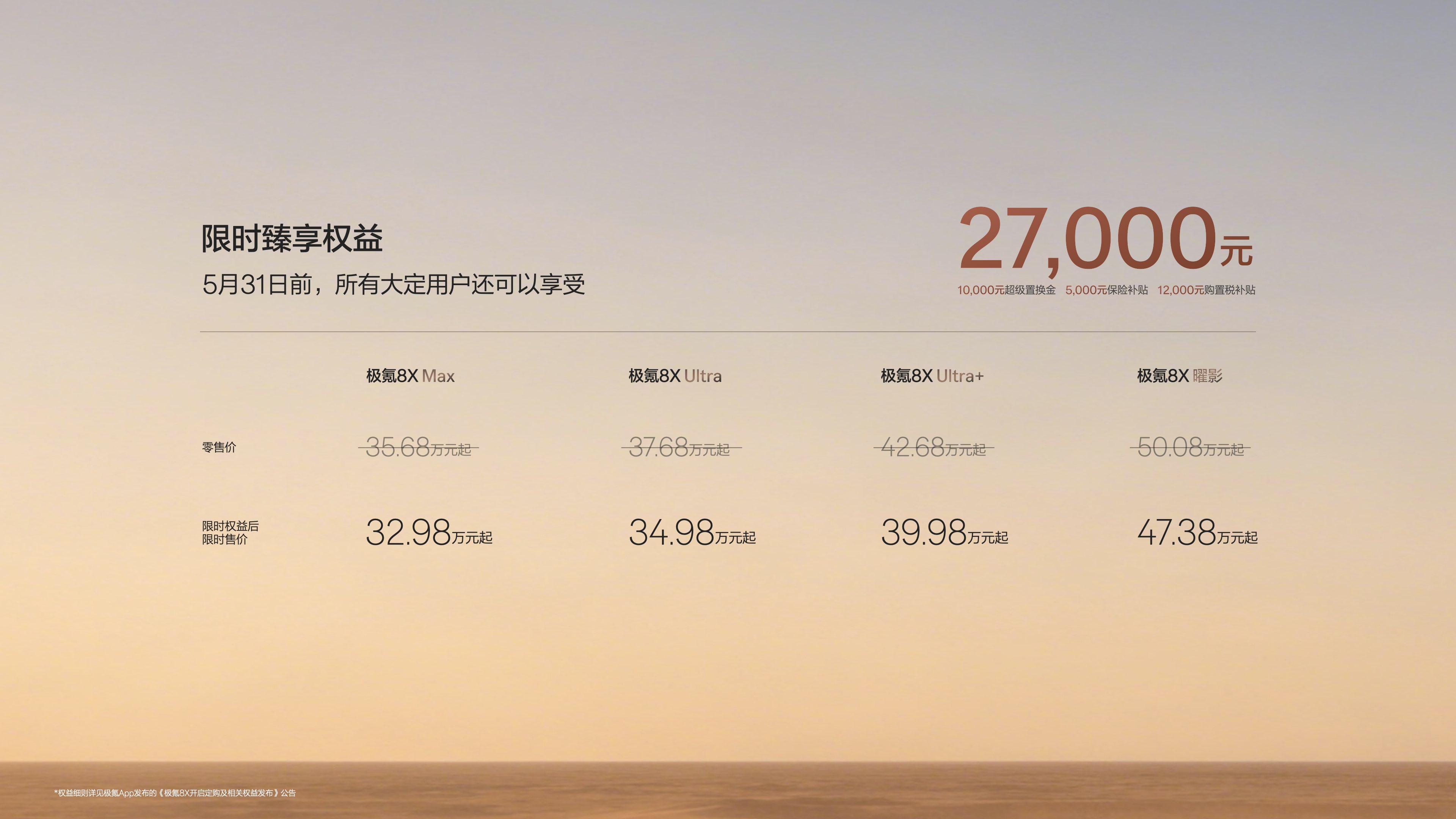 本次极氪8X推出Max版、Ultra版、Ultra+版三款常规车型,零售价35.68万起、37.68万起、42.68万起,享上市权益后限时售价分别低至32.98万起、34.98万起、39.98万起;同步上市的极氪8X曜影版,零售价50.08万起,权益后限时售价47.38万起。