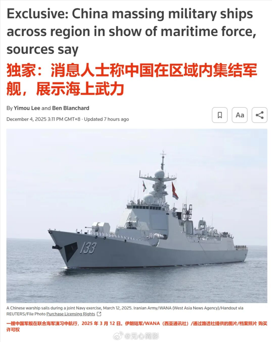 据路透社报道,12月4日,中国协调了100多艘海军和海警的舰船横跨东海和南海,几乎同时在多个航区移动,执行了此次似乎是中国有史以来“最大规模的海上武力展示”,意在向外界显示海上武力。