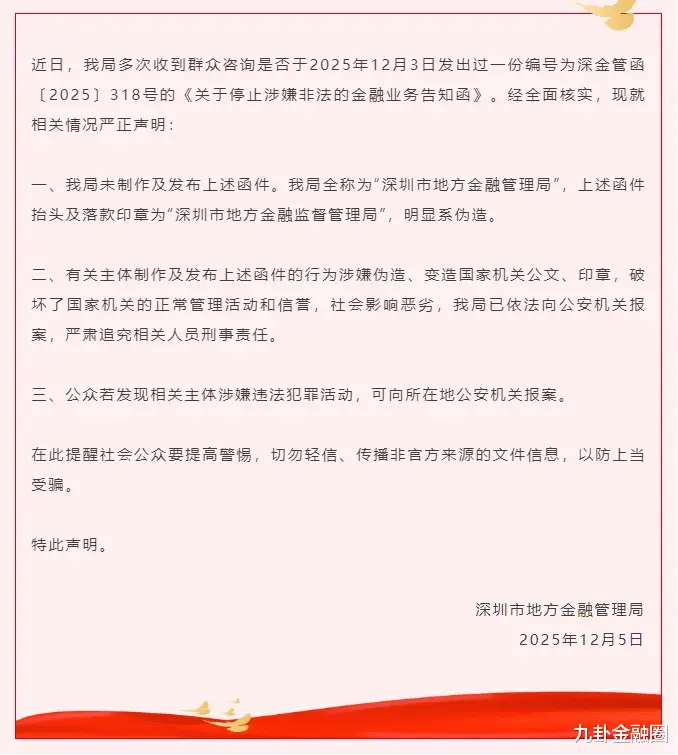 “深圳金融”微信公众号12月6日发布严正声明:近日,我局多次收到群众咨询是否于2025年12月3日发出过一份编号为深金管函〔2025〕318号的《关于停止涉嫌非法的金融业务告知函》。