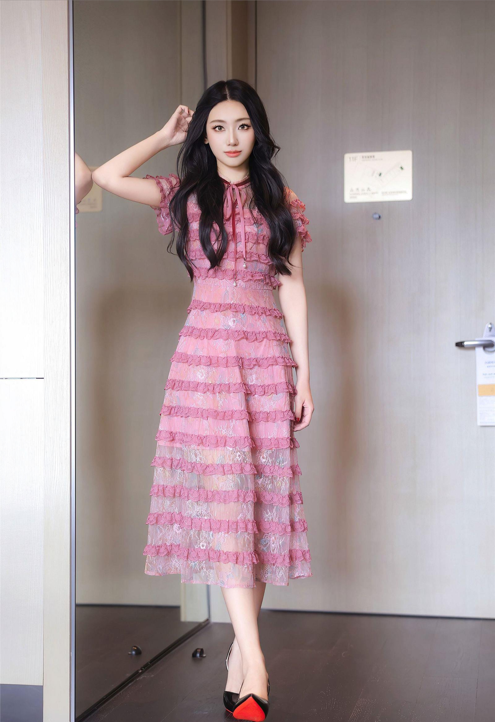 身着粉色蕾丝连衣裙的年轻女性侧倚木门,黑发垂肩,目光略带挑逗。裙摆层叠的荷叶边与黑色红底高跟鞋相映,优雅中透出妩媚。简洁