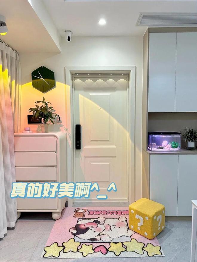 3、网友@J.W的家:作为一个注重生活氛围感的人,怎么能少得了灯光呢?在入户门上方安装一根嗞吸灯,再弄几面小旗子衬托灯光层次,瞬间就为空间增添了一抹温暖和趣味性。