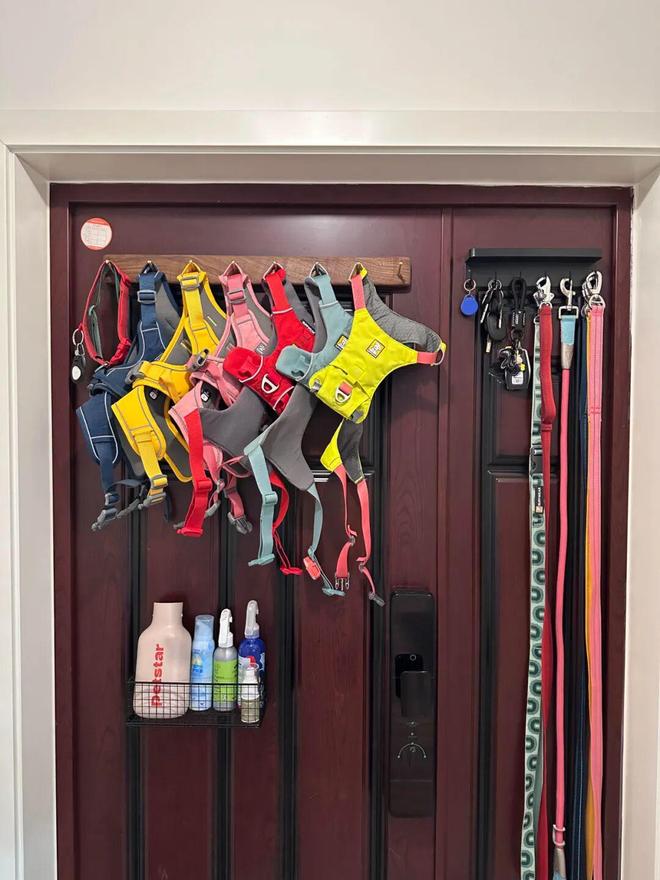 只需要给入户门上安装两个挂钩架,胸背和牵引绳统统都可以挂在门上,下面还可以装个网篮收纳消毒用品,这样带狗子出门再也不用翻来翻去了,关键还不占空间。