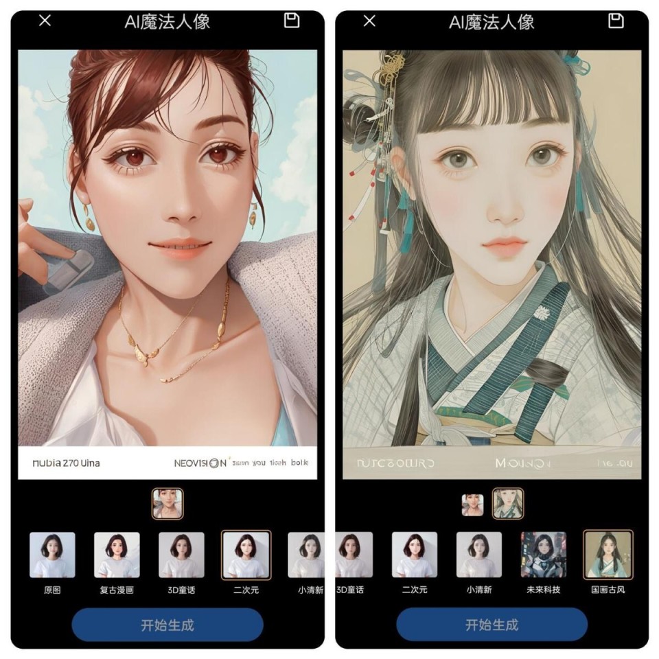 AI魔法人像可以将人像照片转换成复古漫画、3D童话、二次元、小清新、未来科技、国画古风、将军百战等多种风格,让你的照片瞬间变成独一无二的艺术作品。例如,你可以将孩子的照片转换成可爱的3D童话形象,记录他们的天真烂漫。
