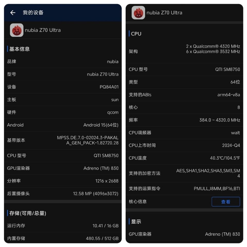 搭载了高通新一代3nm旗舰芯片——骁龙8至尊版,通过全大核设计,努比亚Z70 Ultra配备高通骁龙8至尊版芯片,以其超4GHz主频和2颗4.3GHz超大核、6颗3.5GHz大核的配置,在性能上超越前代骁龙8 Gen3和A18。