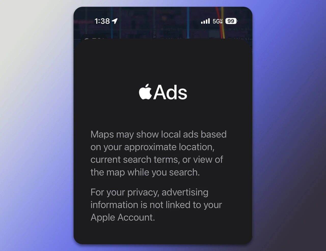 升级至 iOS 26.5 Beta 2 后,苹果地图应用又进一步升级,新增了一个启动画面。打开地图应用时,有可能会弹出“广告”提示,内容提到:地图可能会根据您的大致位置、当前搜索词或您在搜索时的地图视图显示本地广告,但明确不会与 Apple ID 绑定。