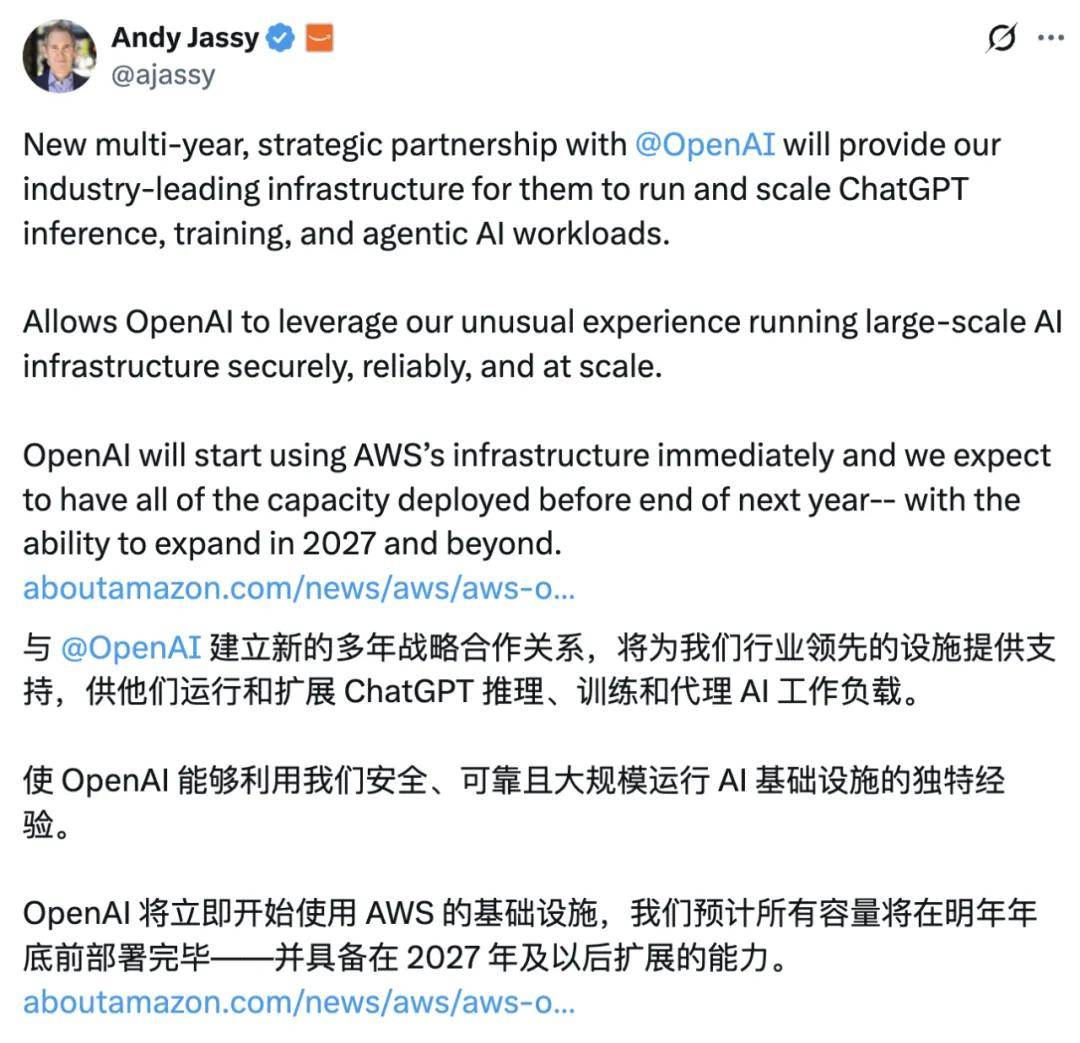 AWS CEO 马特・加尔曼表示,「AWS 的顶级基础设施将成为 OpenAI 实现 AI 雄心的支柱,我们优化计算资源的广度与即时可用性,充分体现了 AWS 为何能独特地支持 OpenAI 庞大的 AI 工作负载。