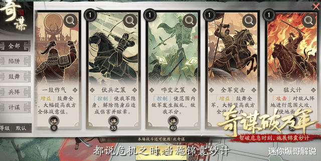 当两名武将对敌人形成夹击时即可触发合击;而奇谋则允许玩家在战场上使用如猛火计、洪水计等经典三国计谋,且每个关卡只能使用一次,考验玩家的时机把握能力。