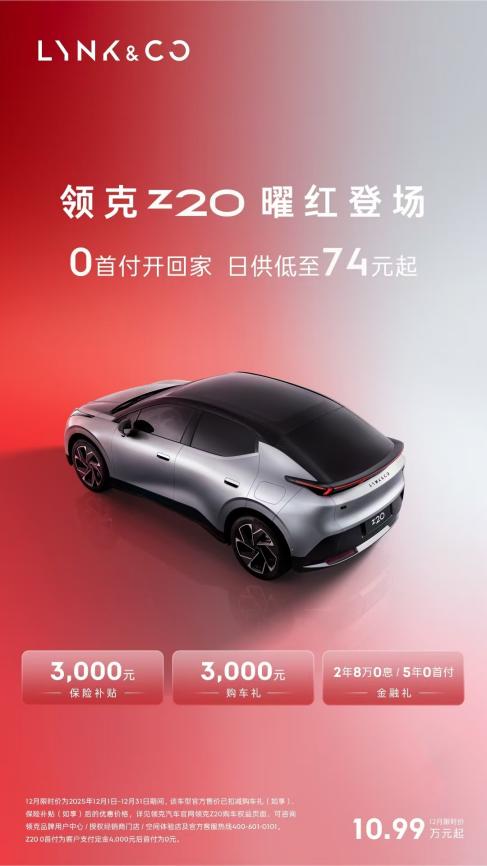 年轻一代的消费理念早已改变,不再愿意为了“拥有”而背负沉重债务,更追求“低压力、高体验”的消费方式,购车也不例外。既想拥有一辆精致实用的座驾,又想保持灵活的资金状况,不想被月供压得喘不过气。12月下订领克Z20,便完美契合了这种“轻消费”理念。0首付政策彻底释放了初期资金压力,让购车不再是“经济负担”,精致出行从容可得;多重购车优惠进一步降低综合成本,不用为了福利勉强消费;曜红版限时解锁联名电气灯,满足个性表达;适配车品超值折扣、家充自由福利,让用车成本也更可控。试驾专场亦有豪华好礼等候,让轻压力购车更有获得感。