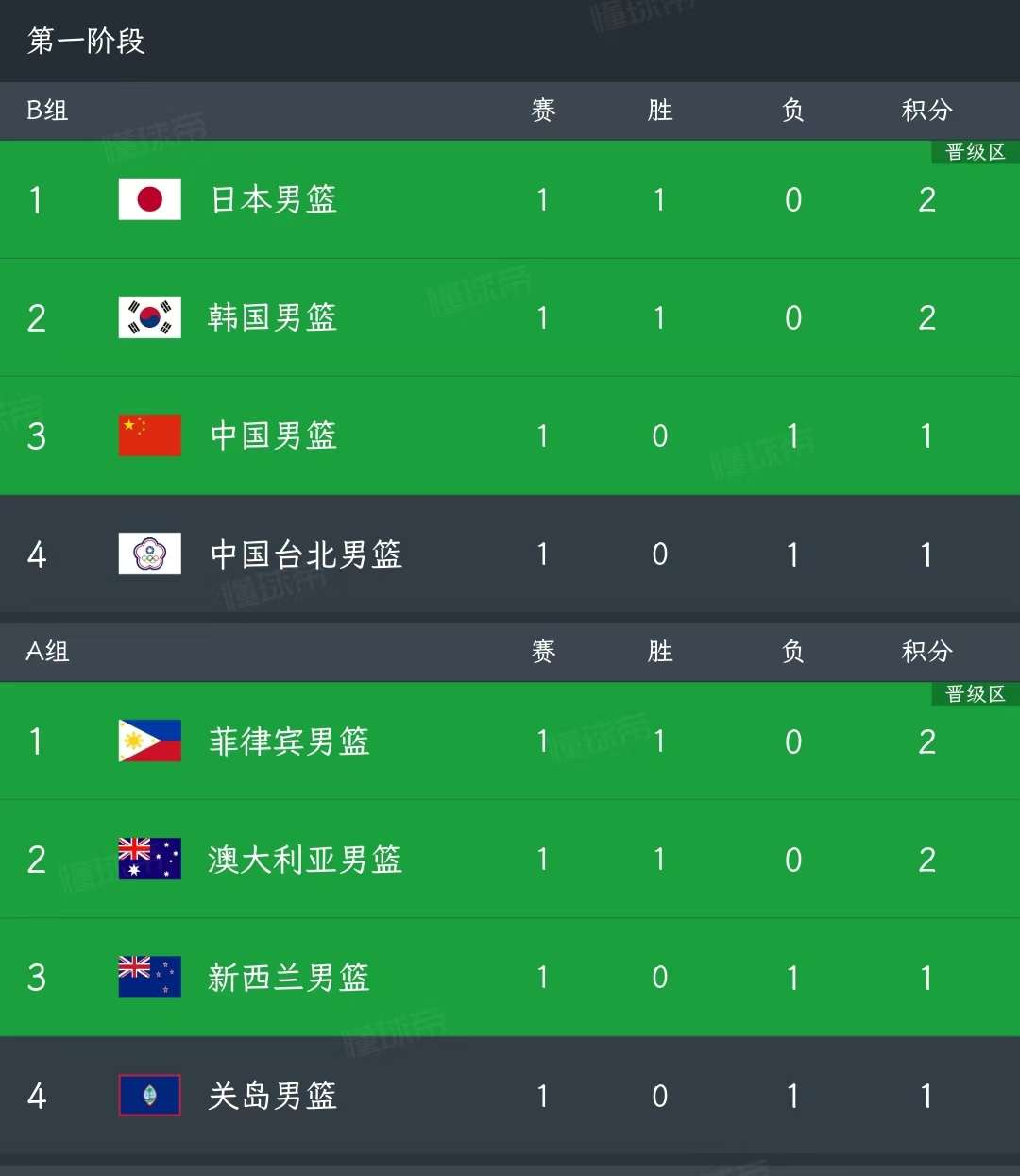 【B组】菲律宾1胜积2分(+41分);2、澳大利亚1胜积2分(+5分);3、新西兰1负积1分(-5分);4、关岛1负积1分(-41分)。