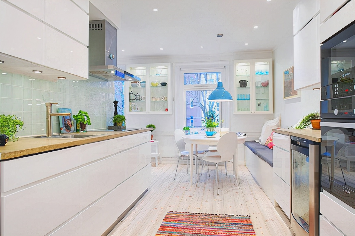 而且整排的橱柜设计非常的好看,整体感非常强,收纳空间也超大,对于不喜欢油烟的人来说,这样的厨房是完全可以满足的。