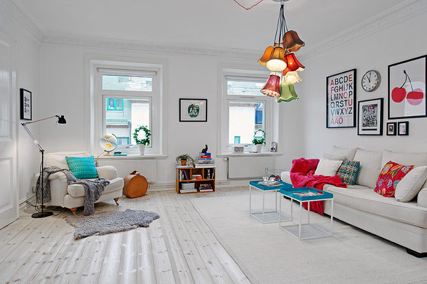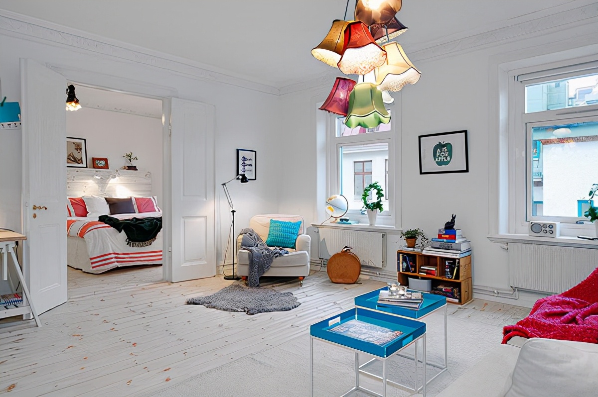 客厅的主灯是彩色灯饰装饰,这种复古的灯饰在白色环绕的环境下,更显得好看,很有复古感。