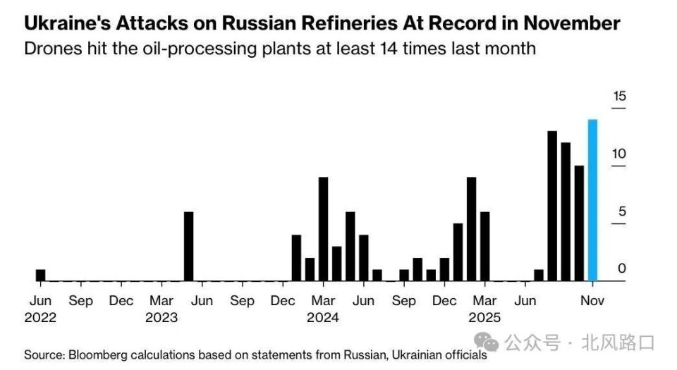 乌克兰还猛烈袭击俄罗斯炼油厂,11月创下袭击14次的历史新高。