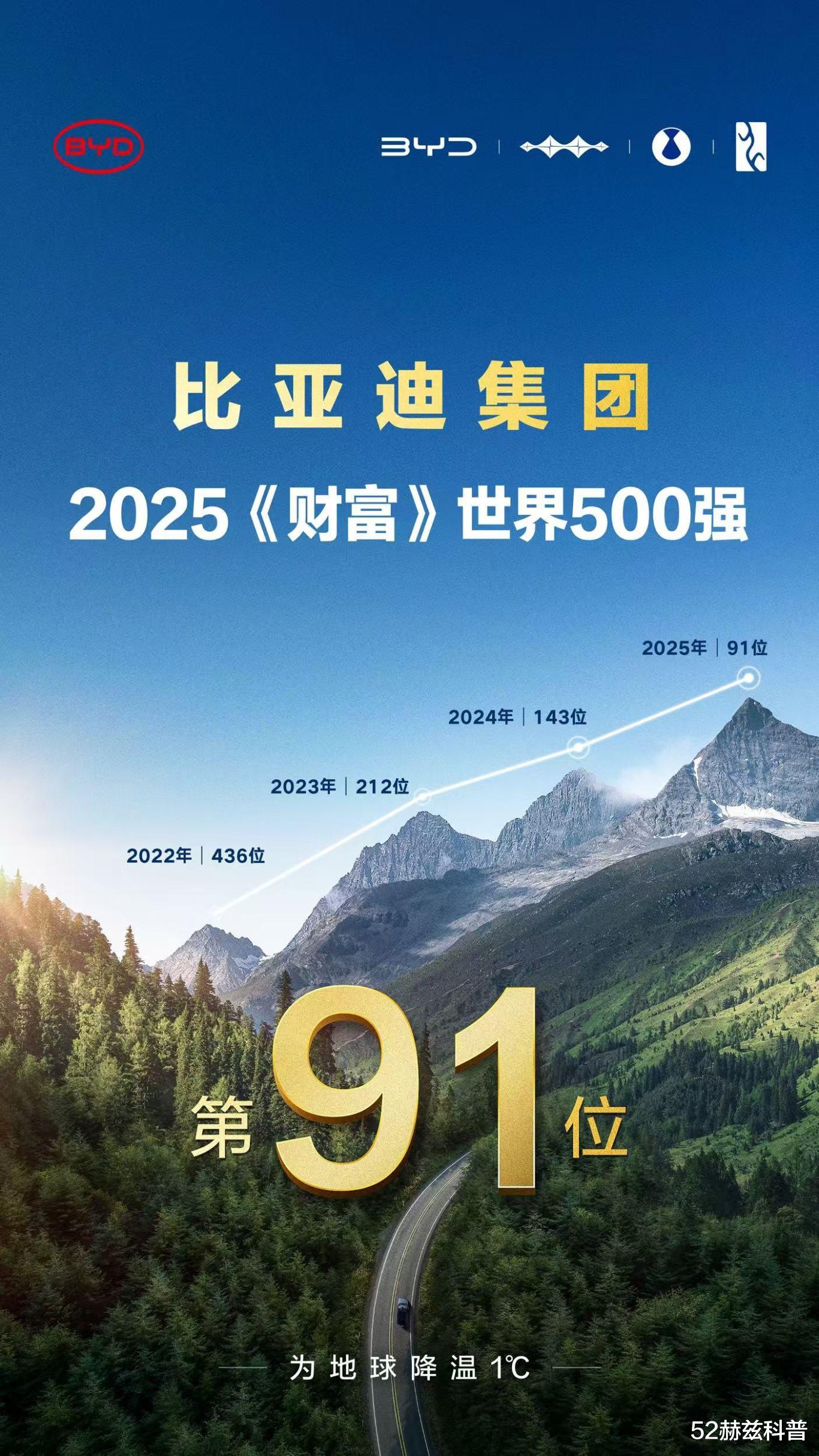 此外,比亚迪还在2025年《财富》世界500强榜单中位列第91位,连续四年上榜,成为排名最高的中国车企!