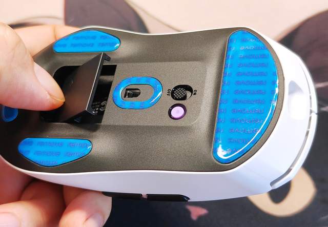 鼠标底部可以看到有五块脚垫区域,顶部的最大,下方一圈也都是脚垫,实际使用时可以把保护贴纸撕下来,用起来会更加丝画流畅哦!