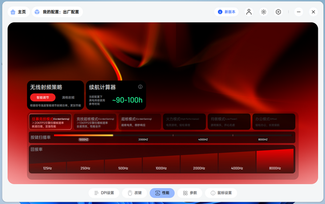 对于我们普通用户难道就不能自定义了吗?当然不是,雷柏APP中还专门为新手小白设置了一个性能模式选择功能,只需要选择对应的模式,鼠标就会变成不同的状态,比如日常偶尔打游戏使用可以选择“火力模式”;如果只是平常办公,为了节能省电就可以选择“办公模式”;而如果你经常玩电竞游戏,那么就可以开启“狂暴竞技模式”,鼠标马上化身手中的战神利器,回报率开满到8000,让你的操作快人一步。