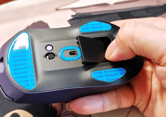 底部还有一个开关和一个按键,日常不用的时候可以关机,不过雷柏VT9的续航实力很强,就算一直不关机也能用很久,所以底部的这个按键几乎是用不到的。