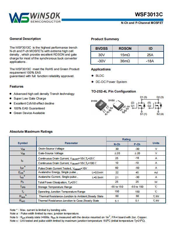 双沟道集成架构:单TO-252-4L封装集成N沟道(30V/25A)与P沟道(-30V/-18A),天然适配H桥驱动拓扑,无需外配对管,简化电路设计。