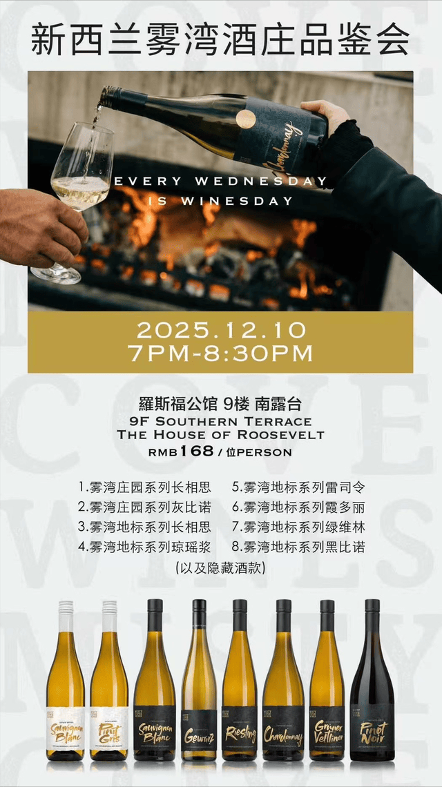 下期预告:罗斯福公馆新西兰雾湾酒庄专场品鉴会时间:2025年12月10日 晚7:00地点:罗斯福公馆9楼南露台