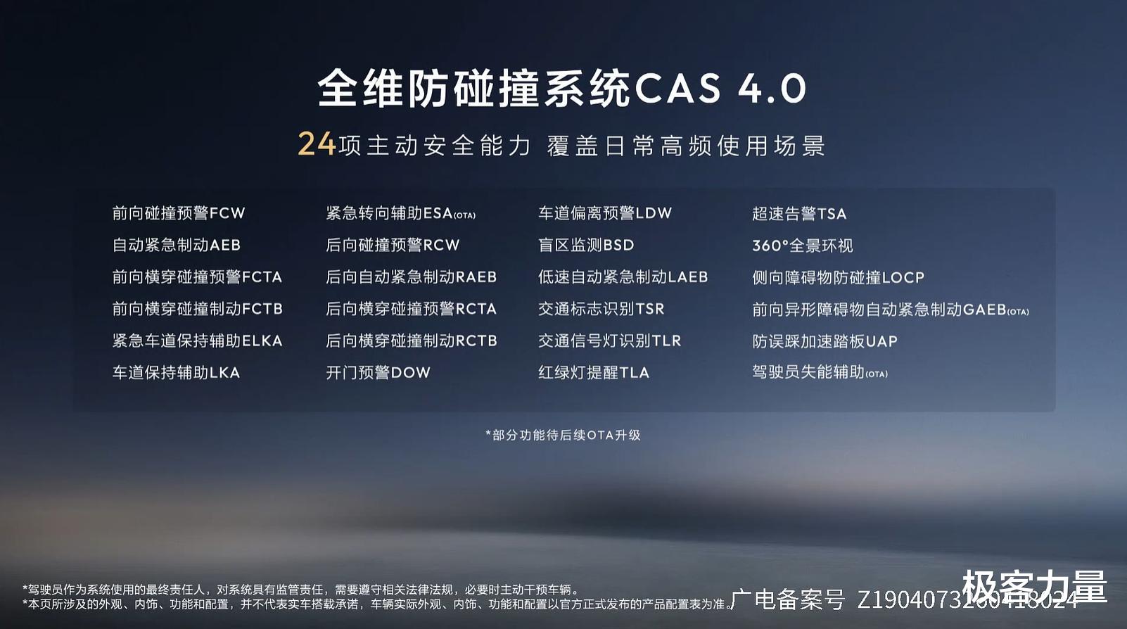 安全保障方面,新车搭载CAS 4.0全维防碰撞系统,集成24项主动安全能力,覆盖前向 / 后向自动紧急制动、侧向障碍物防碰撞、盲区监测、开门预警、防误踩加速等日常高频风险场景,配合华为乾崑智驾海量数据积累与算法优化,全方位守护出行安全。