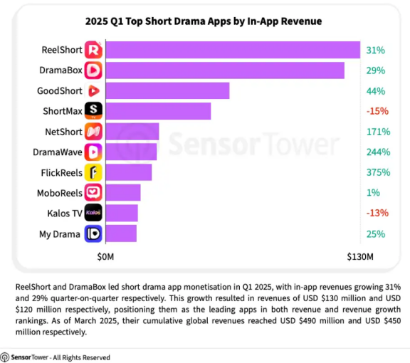 下图:2025年第一季度,微短剧中企ReelShort和DramaBox的应用内收入分别增长了31%和29%,达到1.3亿美元和1.2亿美元。这两款应用程序在海外短剧应用程序的全球收入和收入增长排行榜上均稳居前两名(图源:经济传播学人)