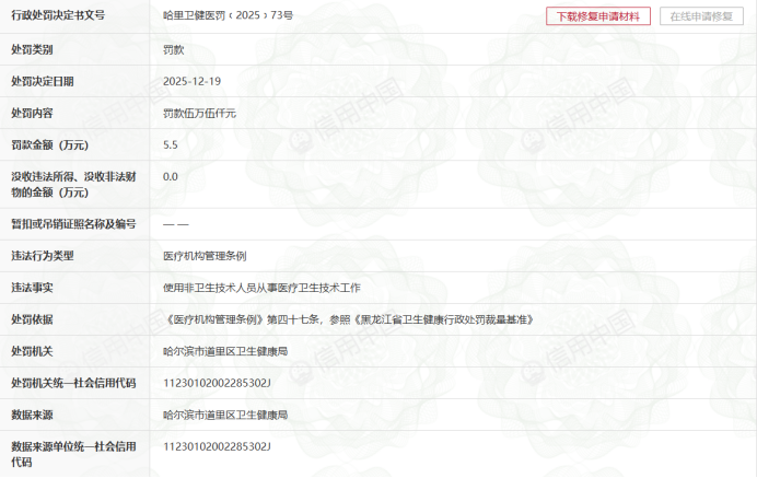 此次处罚依据《哈里卫健医罚﹝2025﹞73号》行政处罚决定书,监管部门查实该公司存在“使用非卫生技术人员从事医疗卫生技术工作”的违法事实,违反《医疗机构管理条例》核心条款。依据《医疗机构管理条例》第四十七条及《黑龙江省卫生健康行政处罚裁量基准》,哈尔滨市道里区卫生健康局对其作出5.5万元的罚款处罚。