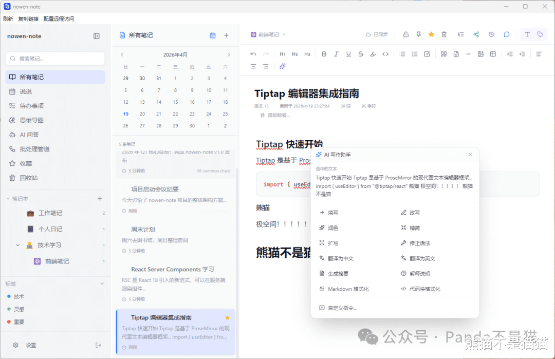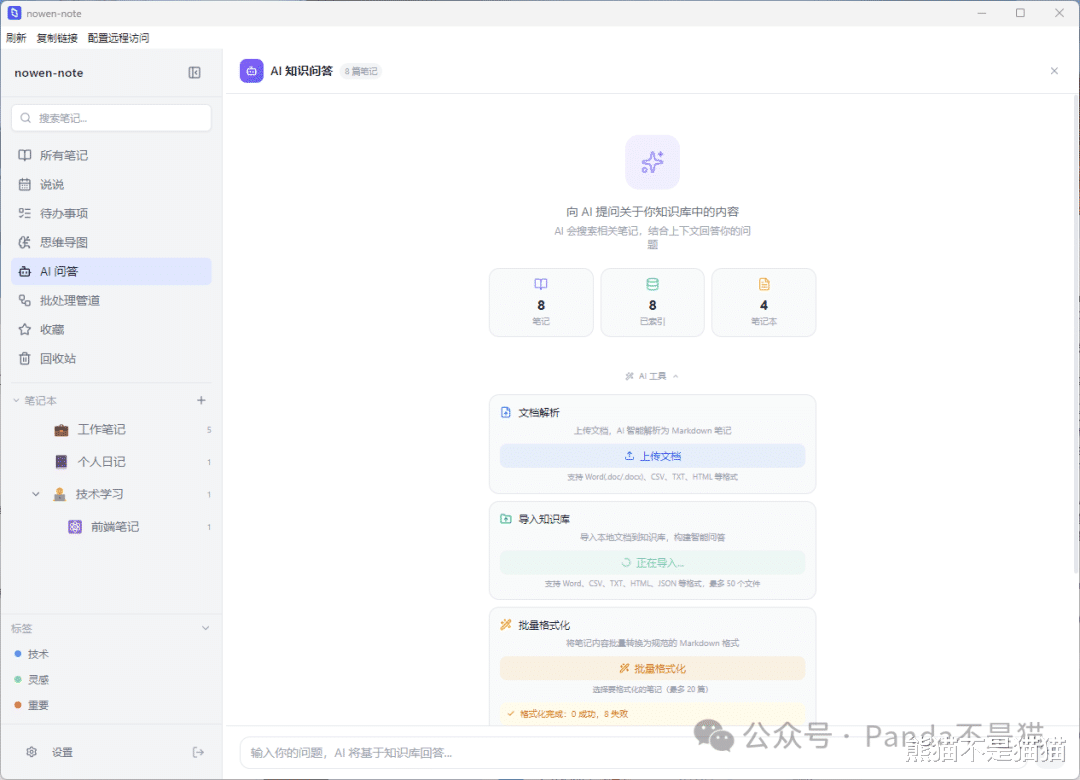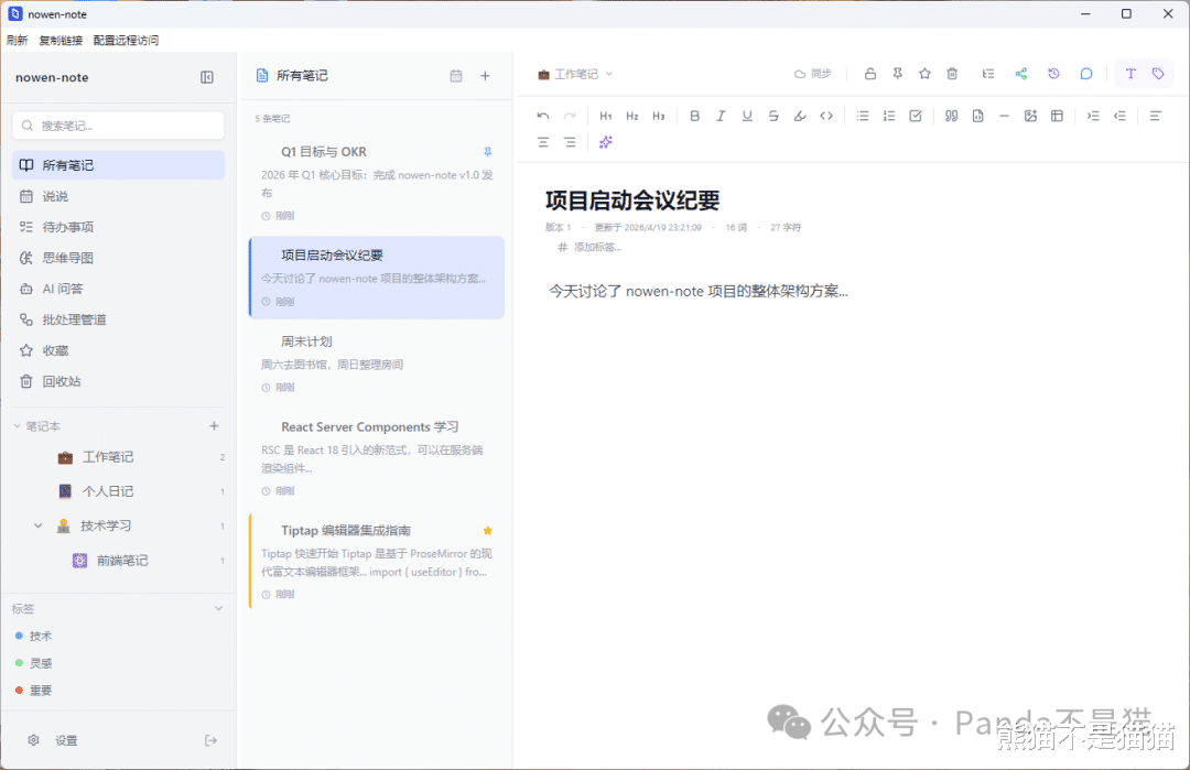 不过作为一款笔记软件,我需要的是它能随时打开记录,所以多端的需求其实非常重要。今天要介绍的nowen-note不仅拥有web端,还有对应的桌面端和移动端,同时它还集成了待办、AI助手、RAG知识库以及思维导图和类微博的动态功能,甚至还提供了批处理功能。
