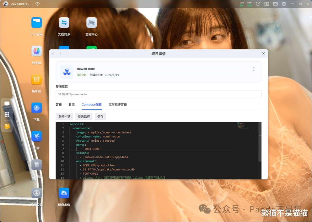 项目部署nowen-note的部署并不难,打开极空间的Docker,来到Compose新建项目,随后输入以下代码: