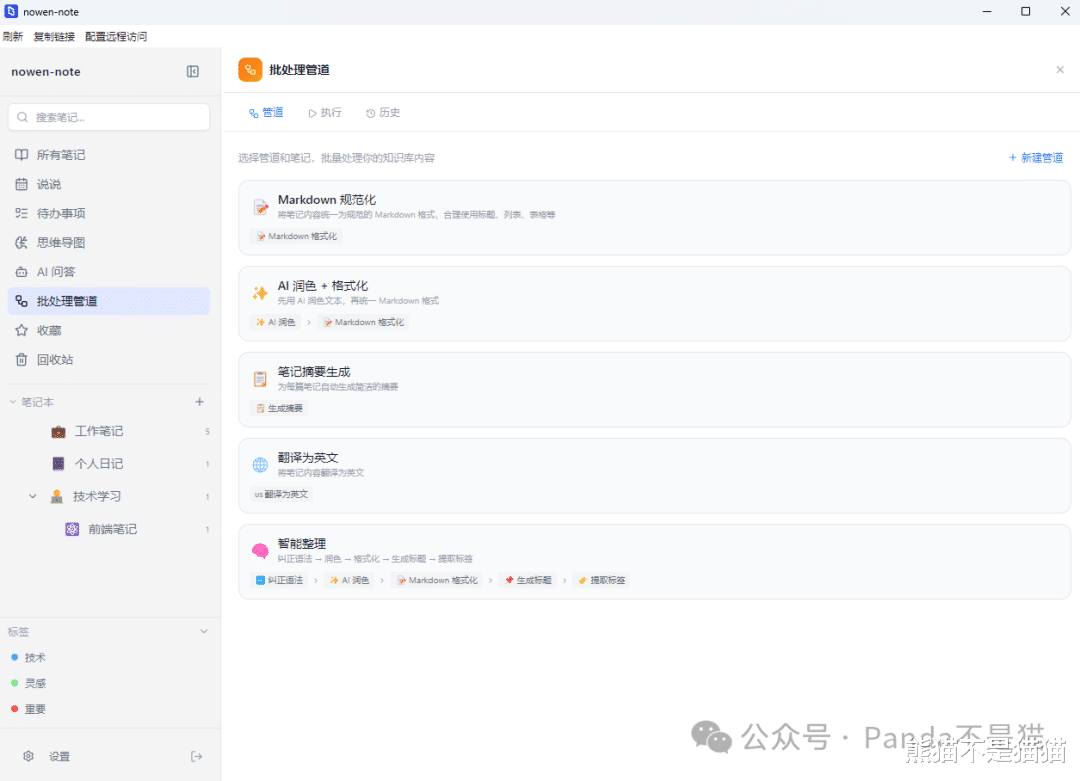 当笔记足够多之后,可以通过批处理来批量处理内容,就不需要在手动去设置AI来生成,同时这里也支持新建管道,可以定制你想要的自动化程序。