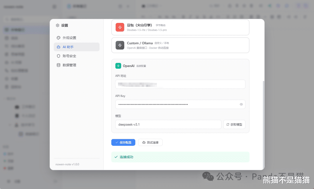使用前记得先配置好AI,点击左下角的设置在AI助手中就可以配置了。目前支持千问、Openai、Gemini、DeepSeek、豆包以及本地Ollama大模型,其中OpenAI支持兼容接口的第三方站点。