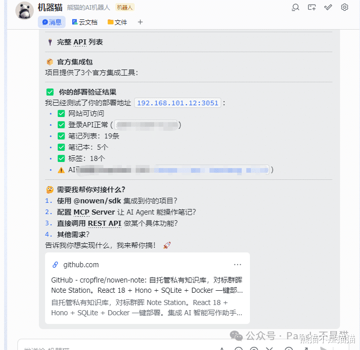 具备三端互通、拥有AI助手、批自动处理功能以及完整的API文档。加上本身的部署也并不复杂,非常适合有笔记需求的用户。