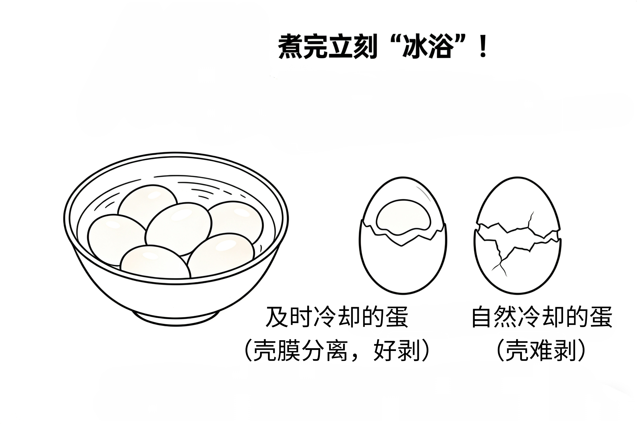 热胀冷缩使蛋白与蛋壳内膜分离,剥壳更轻松完美。