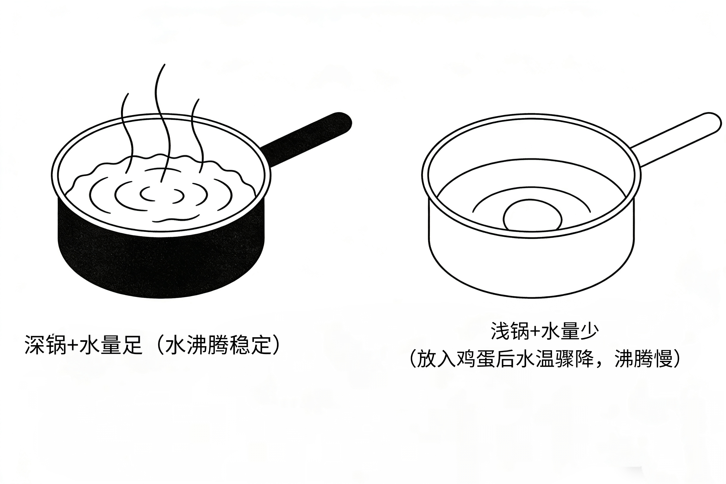 水要足、锅要深,放入鸡蛋后能快速重新沸腾。
