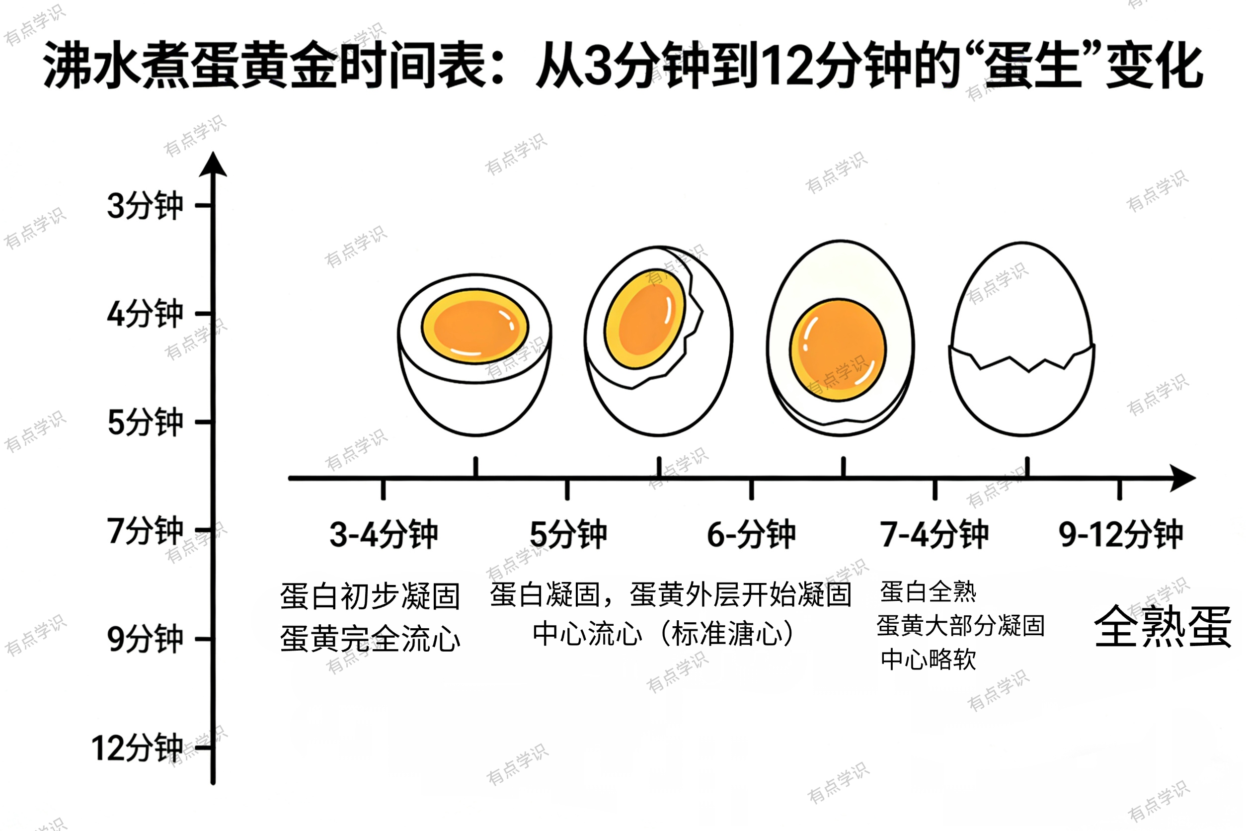 沸水煮蛋黄金时间表:从3分钟到12分钟的“蛋生”变化。