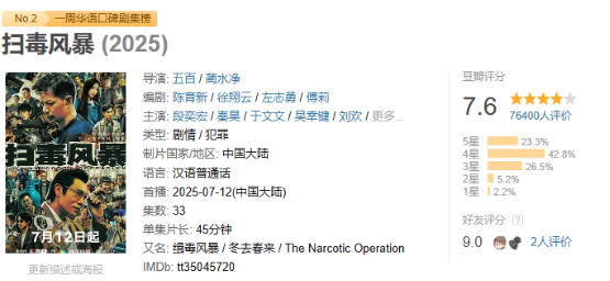 与我上个月看到的电视剧《扫毒风暴》同名。电视剧《扫毒风暴》在豆瓣上有着7.6的分数,不是很高,但也在国产电视剧的标准线上,我和朋友都认为国产剧在豆瓣上普遍要加一分才是正常水准。