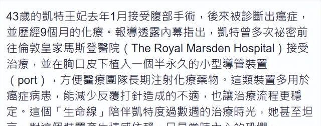 据悉,43岁的凯特王妃,去年1月接受腹部手术,后来被诊断出癌症,经历了9个月化疗,多次秘密前往伦敦的皇家马斯登医院接受治疗,同时在胸口皮下植入一个半永久的小型导管装置,方便医疗团队长期注射化疗药物,从而减少反复打针造成的不适,这个导管装置陪伴凯特度过数周的治疗时光。