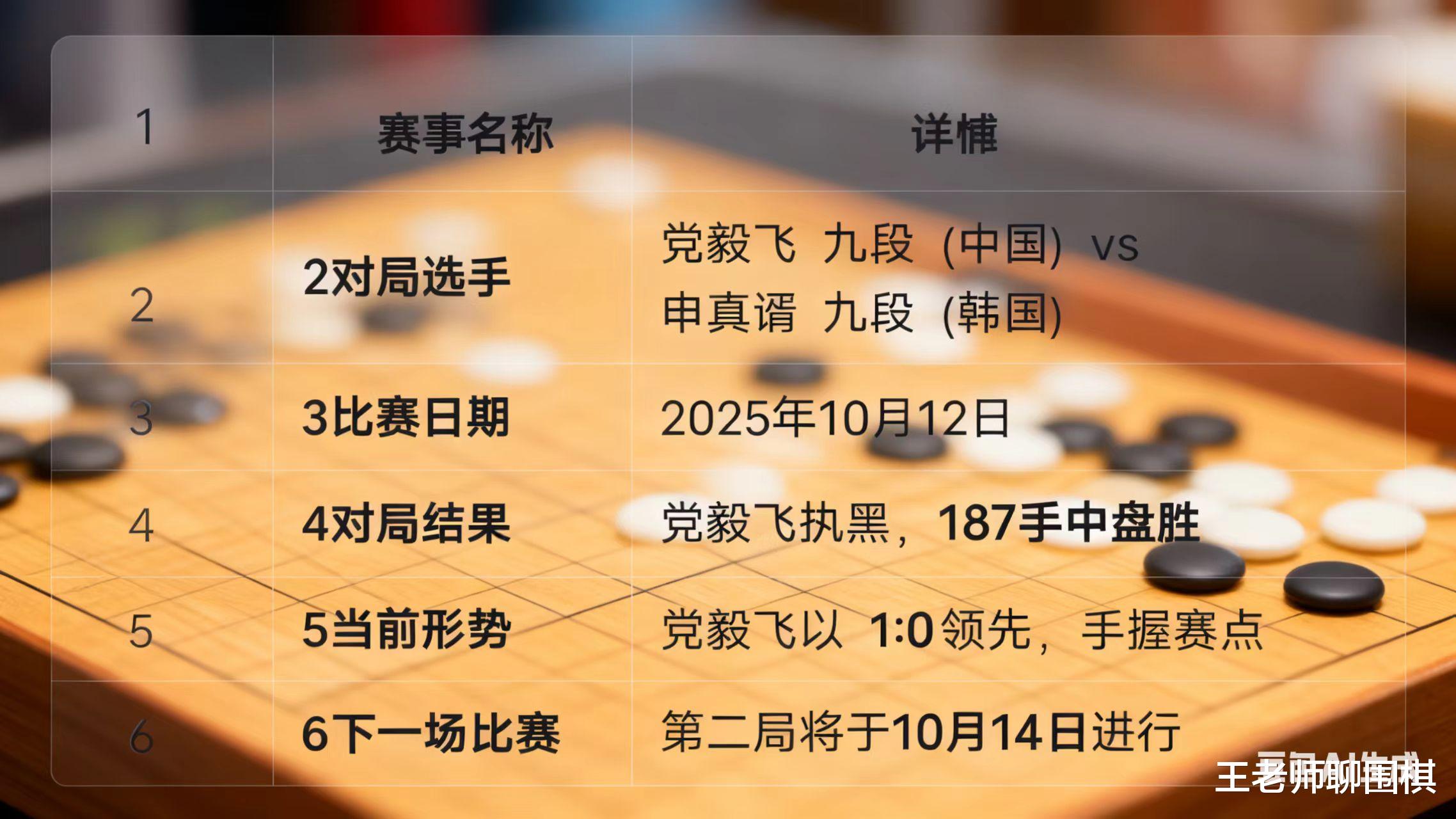 在刚刚结束的2025年第三届烂柯杯世界围棋公开赛决赛首局中,中国棋手党毅飞九段执黑中盘战胜韩国“第一人”申真谞九段,在三番棋决赛中拔得头筹,以1:0领先。这场胜利不仅让党毅飞拿到了赛点,也打破了近期中国棋手对阵申真谞的僵局,意义非凡。仅是个人见解: