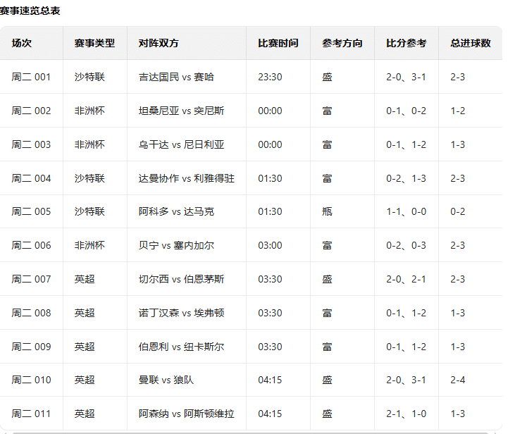 周二010 英超 | 04:15曼联 vs 狼队💡 老朱看法:曼联主场气势如虹,进攻点分散,阵容齐整。狼队垫底,客场表现糟糕,防守漏洞多。主队全面占优,大胜可期。