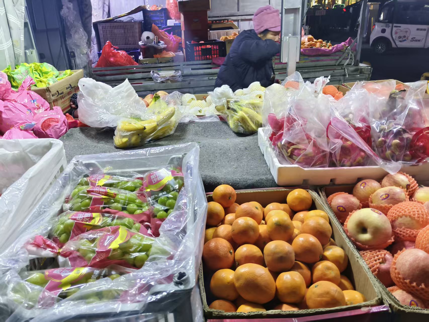 小区路口的车载水果摊,老板娘话少得像块木头——