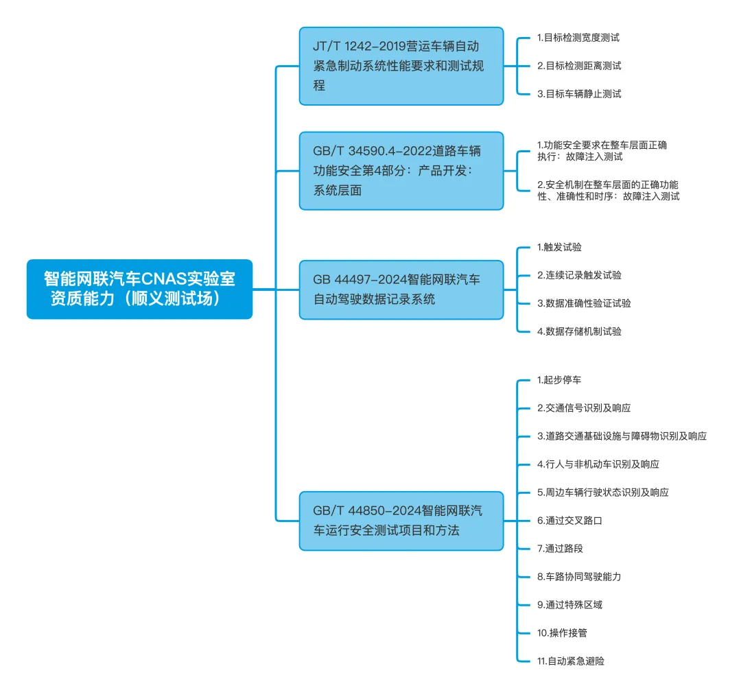 实验室具备多项智能网联汽车关键技术与系统的测试能力,覆盖国内外多项重要标准与法规,其中包含:
