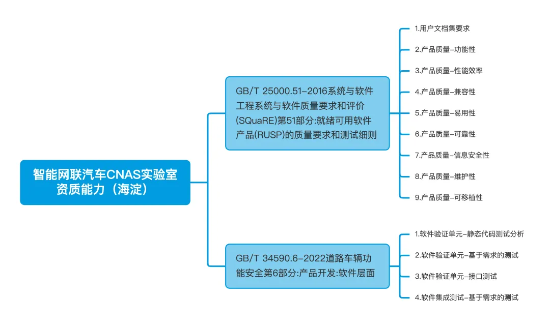 国家标准:GB/T 34590.6-2022《道路车辆功能安全第6部分:产品开发:软件层面》、GB/T 34590.4-2022《道路车辆 功能安全 第4部分:产品开发:系统层面》、GB/T 25000.51-2016《系统与软件工程系统与软件质量要求和评价(SQuaRE)第51部分:就绪可用软件产品(RUSP)的质量要求和测试细则》、GB/T 44850-2024《智能网联汽车运行安全测试项目和方法》、GB 44497-2024《智能网联汽车自动驾驶数据记录系统》等。