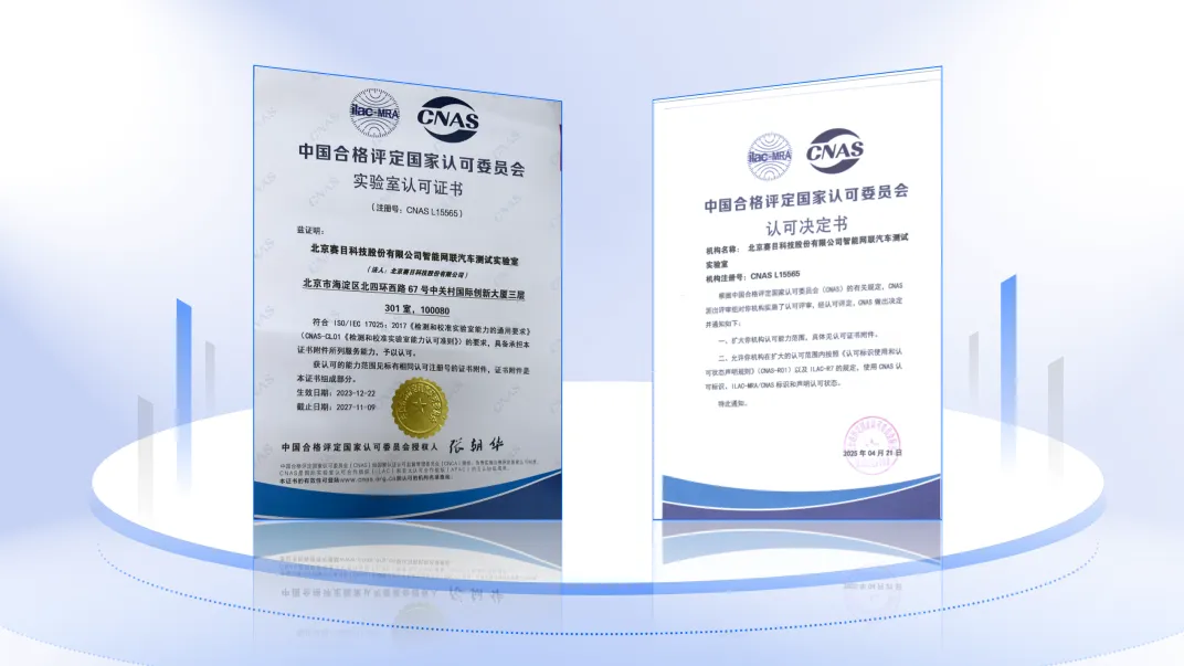 权威认证,筑牢测试公信力基石赛目科技智能网联汽车测试实验室于2021年11月通过中国合格评定国家认可委员会(简称:CNAS)评审认可(注册号:CNAS L15565)。实验室在测试方法、设备精度、环境控制、人员资质、质量管理体系等方面,均符合实验室认可标准,具备向社会出具具有公信力的监测与验证报告的能力。