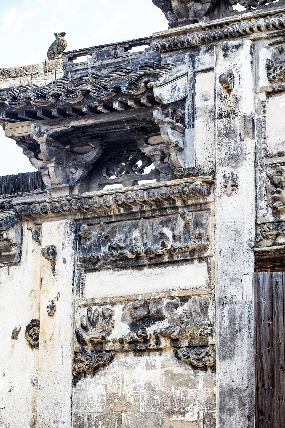 初见德公厅屋的门楼,便被其独特的形制所震撼。它既是厅屋的大门,又能独立成为一座牌坊,这种“门坊合一”的设计,在古代建筑中并不多见。牌坊为砖木结构,共四层,虽经岁月侵蚀,第一二层的砖雕已不复当年模样,残缺的纹路间却仍能窥见昔日的精工细作。而第三层那方“鲤鱼跳龙门”的砖雕图案,却奇迹般地保存完好,鳞片清晰可辨,跃动的姿态栩栩如生。在封建时代,“鲤鱼跳龙门”象征着科举及第、官运亨通,这方砖雕不仅是精美的艺术品,更是主人家显赫官位的无声宣告,默默诉说着“永德公”家族曾经的荣光。
