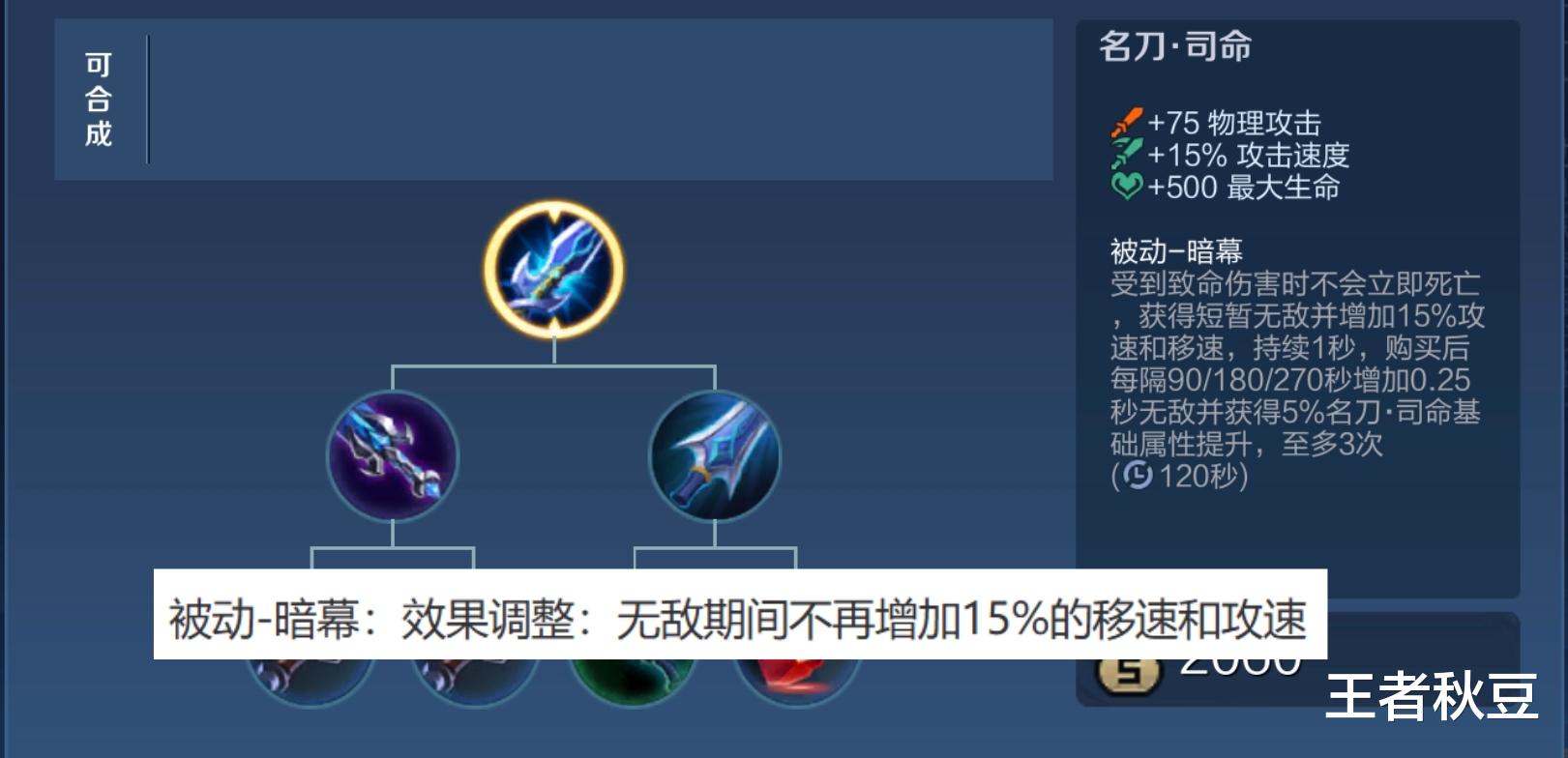 名刀司命效果调整无敌期间内不再增加15%的移速和攻速。说实话,要不是官方发出这条调整公告,我相信很多人可能都没注意到名刀还有额外增加的15%攻速和移速加成。这点削弱对名刀来说,真的没什么。