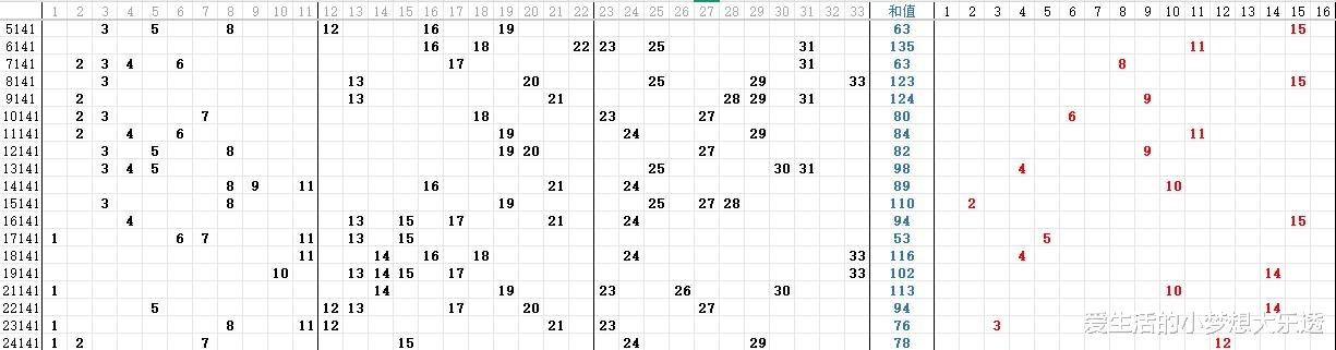 31作为凤尾出现各4次,27 33作为凤尾出现各3次,24 29作为凤尾出现各2次,15 19 23 28 30作为凤尾出现各 1 次。开出凤尾三路 0 路10次,1 路6次,2 路3次,凤尾三路中三路开出较为平均。0路10次开出凤尾,其中27 33各开出3次,24开出2次,最小凤尾15和30各开出1次。1路凤尾6次开出,其中31开出4次是热码凤尾,19 28各开出1次。2路凤尾开出3次,其中29开出2次,23各开出1次。