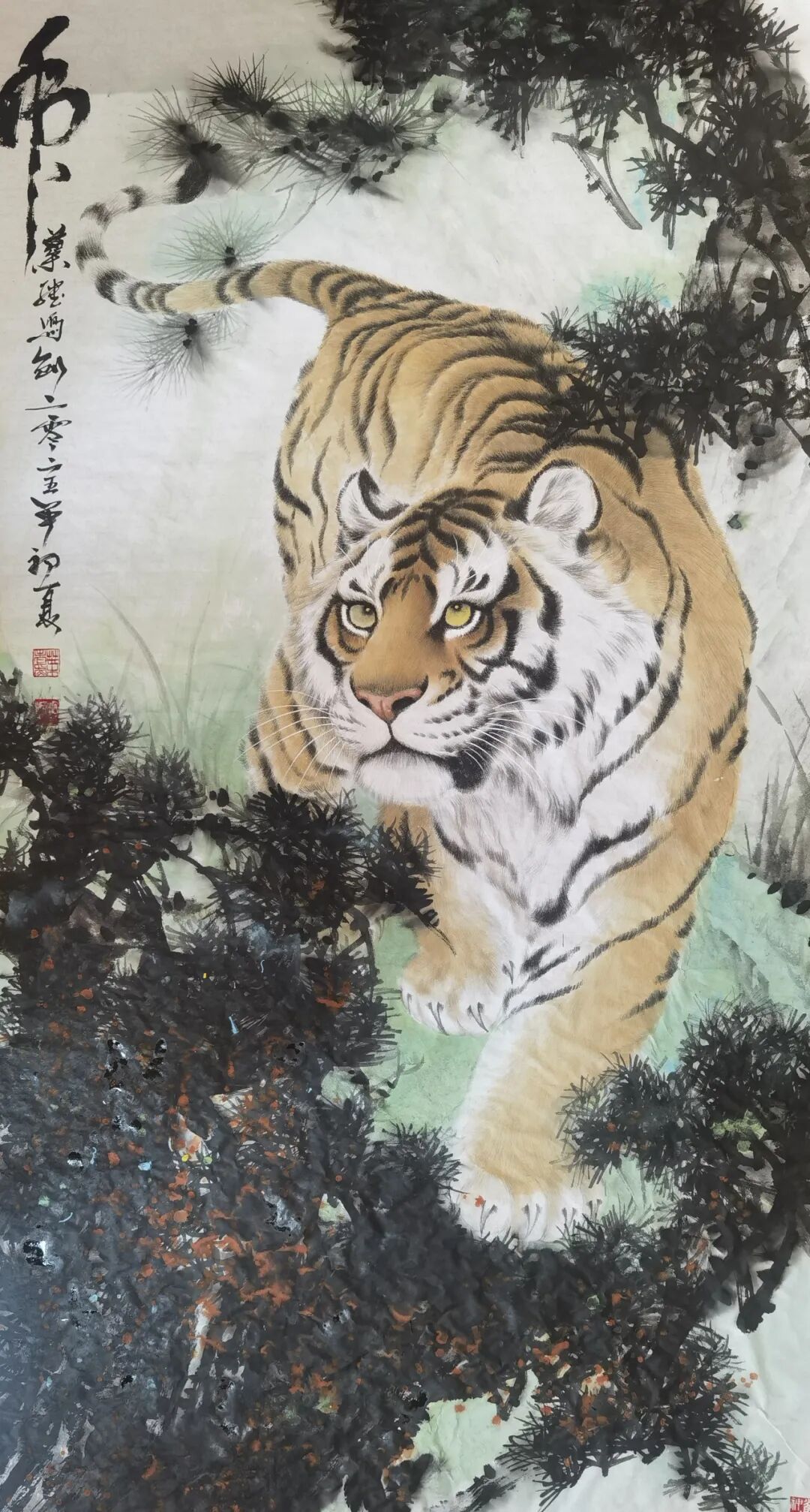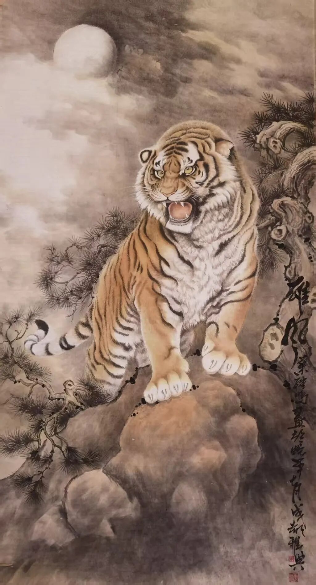 而当他挥毫描绘猛虎,则尽显雄浑磅礴的大家气象。先生深谙“虎威在骨”之理,以苍劲雄健的线条勾勒虎之形骸,以浓重酣畅的墨色渲染其威猛气势。画中猛虎自山巅俯冲而下,筋骨强健如铁铸,通体墨色浓淡相生,笔触如刀劈斧凿,尽显肌肉贲张之力道。虎首昂扬,怒目灼灼似电,仿佛裂壑生风,未闻其啸而威势已迫人眉睫。完美诠释了“虎啸风生,龙腾云起”的东方气魄,凛然正气直贯苍穹。