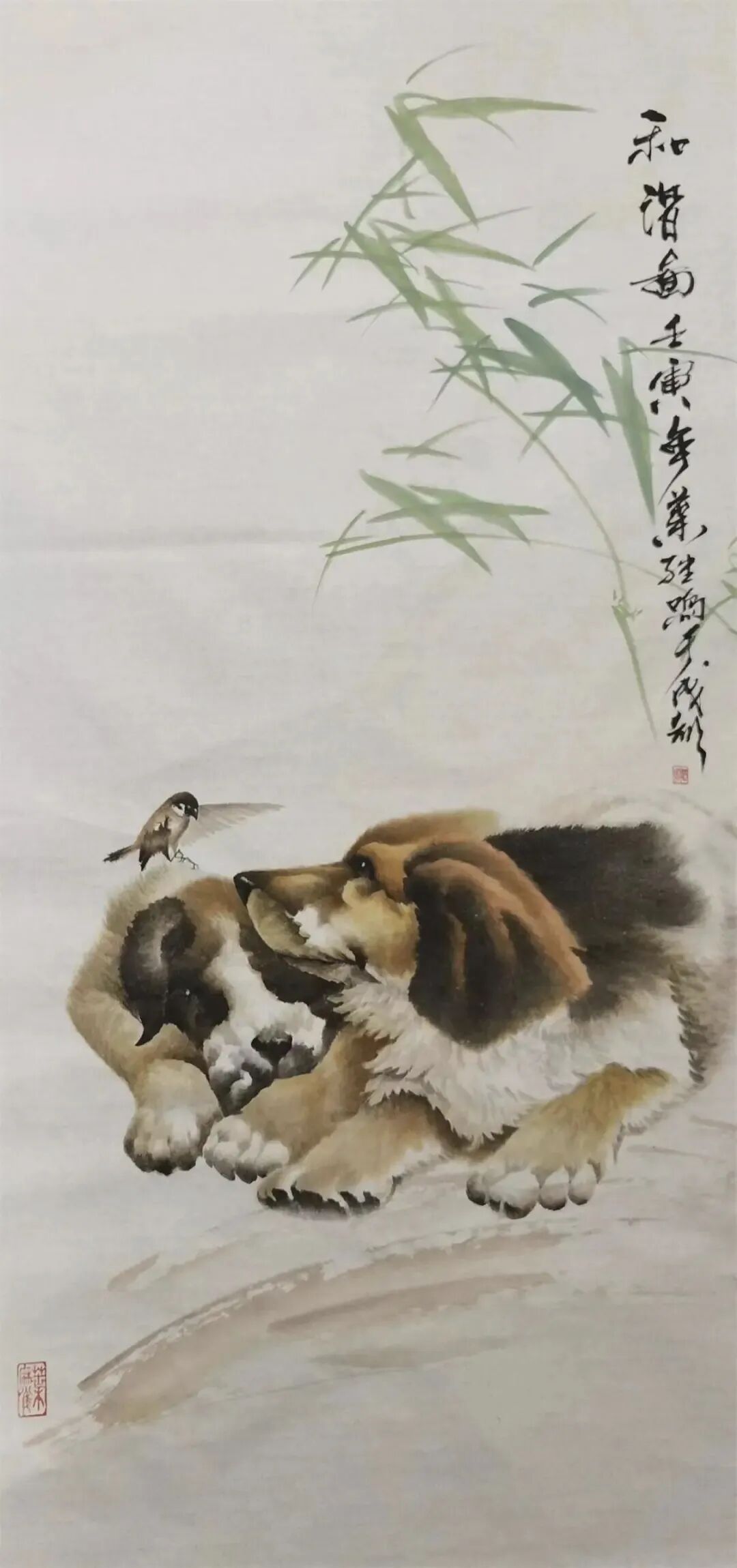 观先生作品《虎年大顺大吉》则淋漓展现了猛兽温情脉脉的深邃境界。画中双虎依偎而卧,身躯盘桓如祥云聚首,线条虽遒劲却流转着融融暖意。二虎额首相抵,目光沉静安详,蓬松皮毛以细腻皴擦层层晕染,于雄浑底色上氤氲出罕见的舐犊情深。此作不仅捕捉了丛林之王的天然亲昵,更以“双虎”谐音“双福”,寄寓了顺遂安康、大吉大利的华夏祥瑞愿景,刚柔相济间尽显生命丰饶。