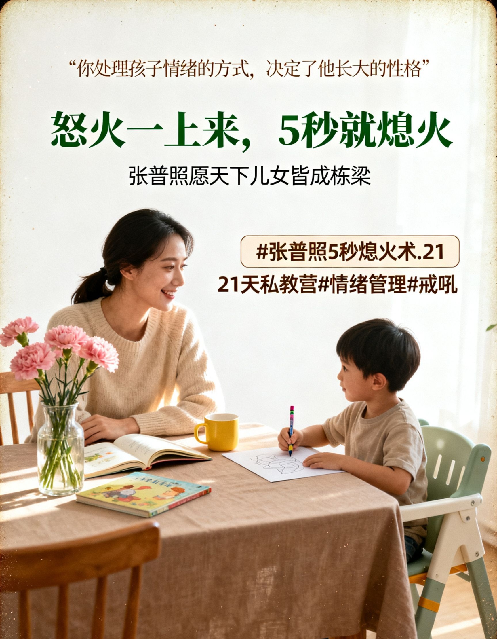 ‘张普照5秒熄火术’,就是帮你 重塑那个决定性“第一反应”的根本方法。 在孩子的情绪激流即将引爆你,让你做出破坏性反应的 那个5秒,帮你 在内心完成一次关键的“反应重置”。没有这个5秒的‘模具重铸’,你一切有意的教育,都抵不过你无意中通过情绪反应进行的每一次‘性格复印’