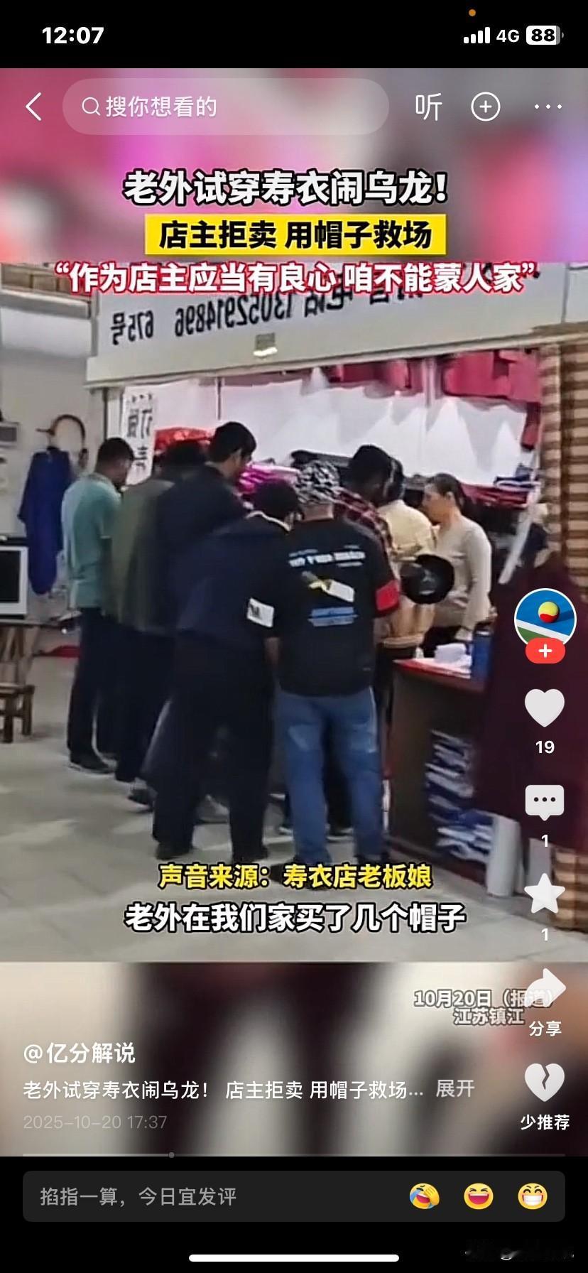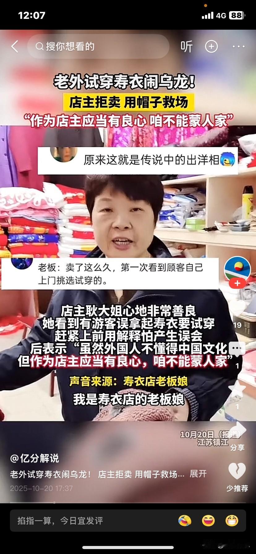 外国人:请问这什么衣服? 老板:是寿衣。 翻译:是长寿的衣服。 外国人:我要买[