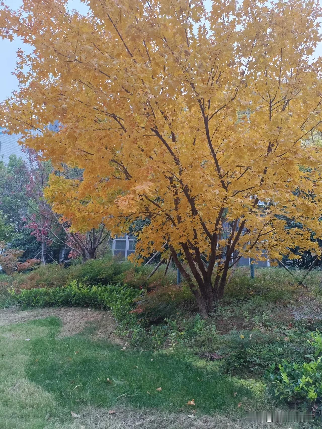 秋天的浪漫是大树给的,一夜秋风,绿叶就被染成了金灿灿的颜色,像一位金发女郎在秋日