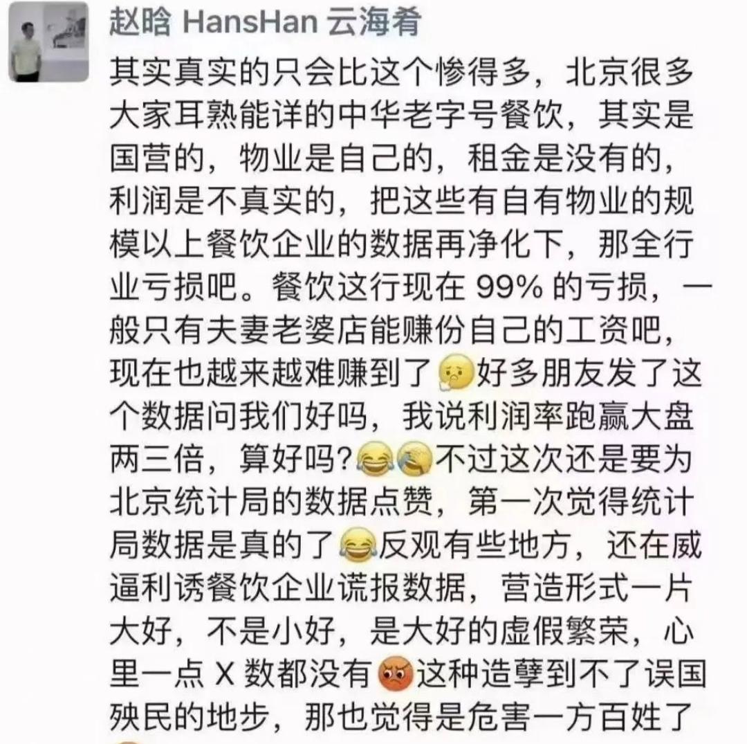 著名餐饮品牌云海肴原董事长赵晗发过一个朋友圈,他说现在只有两种餐饮门店赚钱,一个是老字号餐饮,这类餐饮基本上都是国营的,物业是自己的,所以不需要租金。另一个是夫妻店,不需要请员工,还能赚份工资,其它的基本上都很难赚到钱。